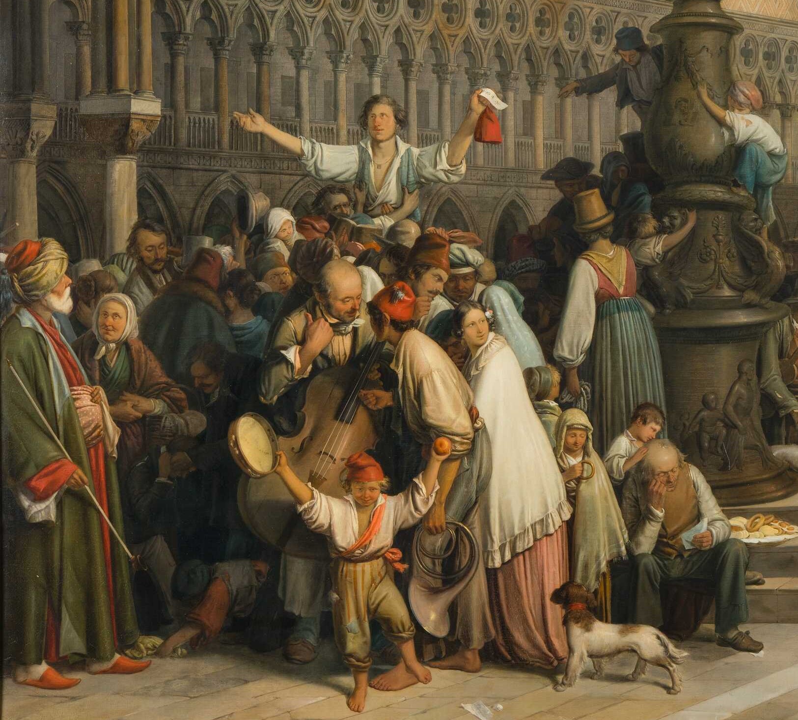 Luigi Serena paints with sensitivity moments such as Washerwomen on the Sile and Victims/The Prayer, while Eugenio Bosa, in The Lottery Drawing in St. Mark’s Square, captures the atmosphere of 19th-century Venice.